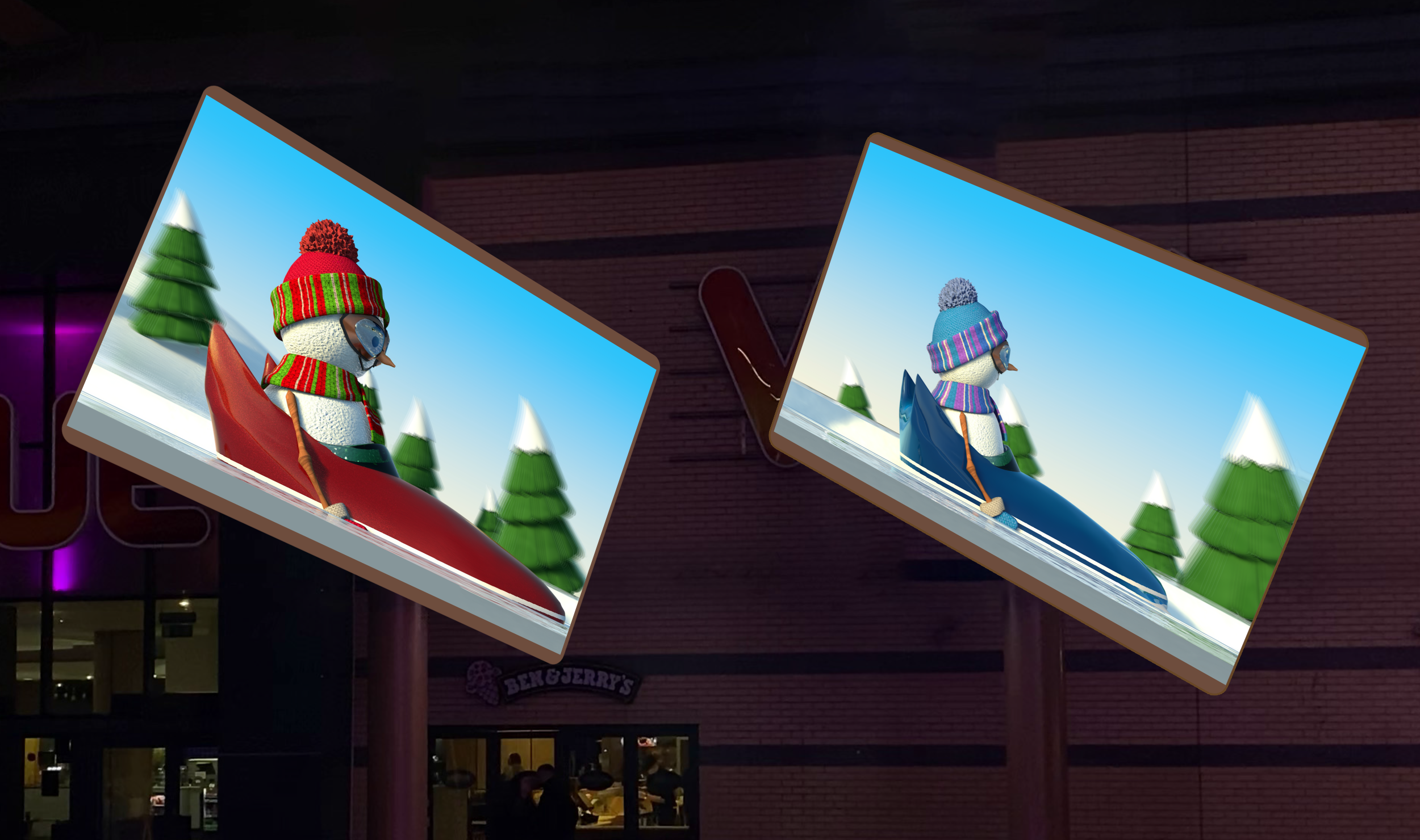 From concept sketches to story to character design, rigging and environment design, I was tasked as sole animator on this three minute children’s show that made fun use of two huge independently spinning screens, while keeping it engaging with fun and familiar characters in a race to the Finish Line Christmas Tree!